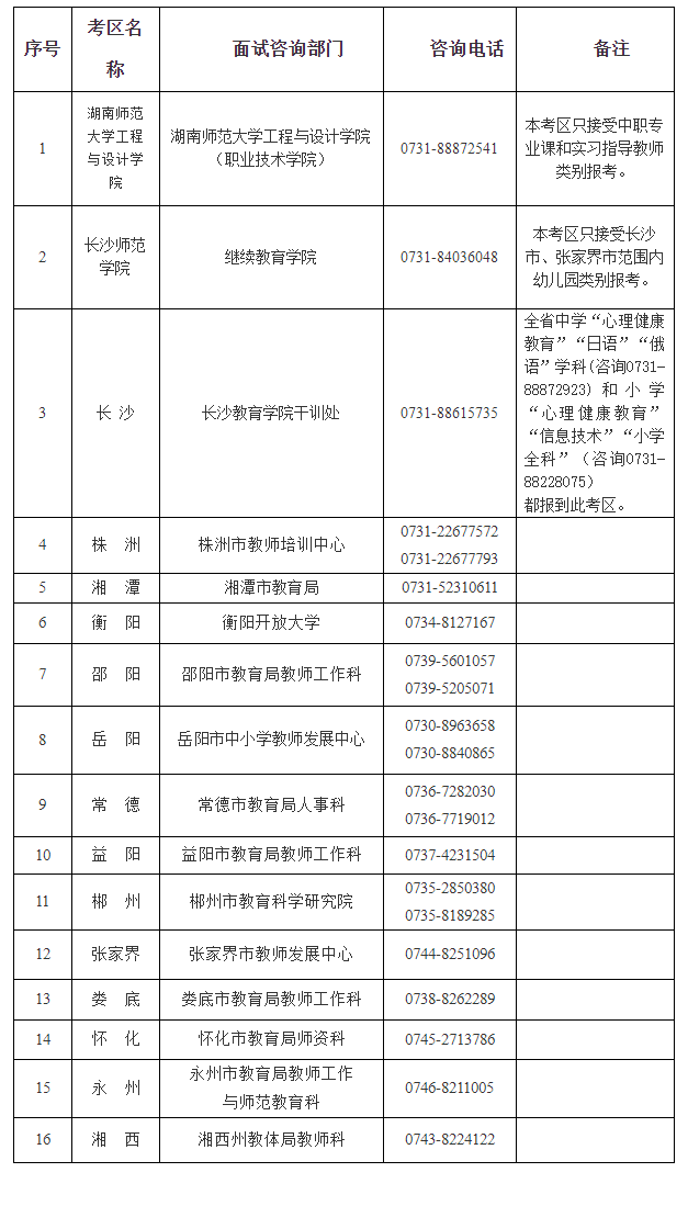 附件:湖南省中小学教师资格考试面试各考区联系地址和电话
