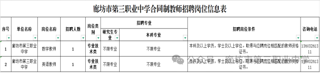 (五)具有岗位要求的相应学历、学位、专业、教师资格证。详见附件《廊坊市第三职业中学合同制教师招聘岗位信息表》。